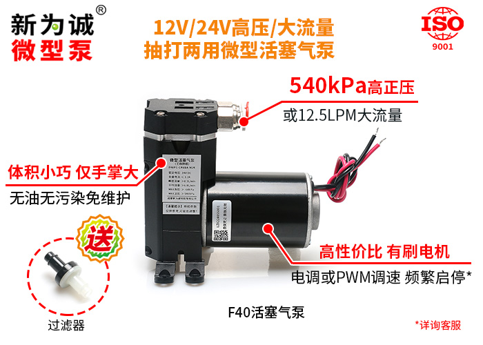 微型活塞气泵F40系列,提供多种选择,不论是“高性价比”还是“长寿命高性能多功能”,总有一款适合您。它实现了工业级微型活塞气泵中,高压力、大流量和小体积的较好结合:自重不足0.7千克,体积仅成年人手掌大,而MAX压力却可达0.43~0.54MPa!峰值流量可达:7.5~12.5LPM。目前国内这么小体积、高压力、大流量的同类活塞微型气泵、微型真空泵产品几乎没有!而国外类似产品价格,则往往是F40的的好几倍!